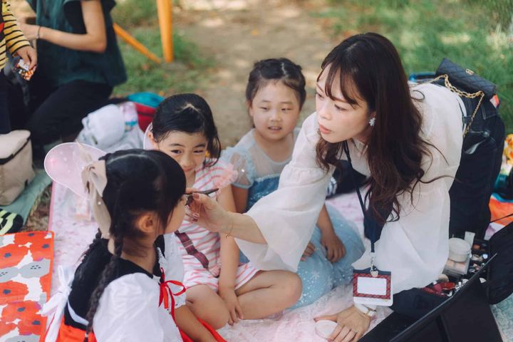 4人の子育てとパーソナルスタイリングサロン経営を両立している3期生の谷 美紗子さん。お子様が通われいてる幼稚園の園児向けキッズメイクレッスンを開催しました。非日常的なハロウィンファッションに仮装し、いつもどおり楽しく過ごせる場所として、レッスン会場には「公園」を選んだといいます。