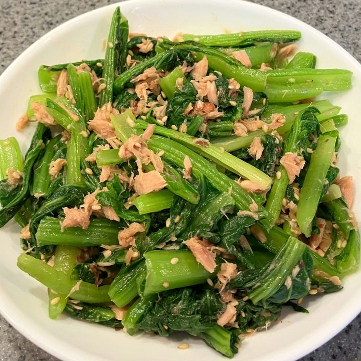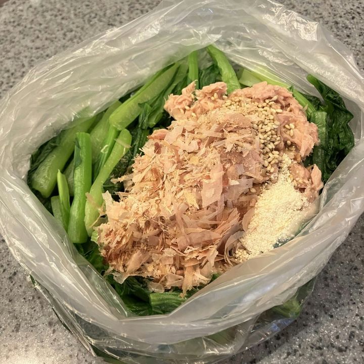 小松菜1束を切ってアイラップで600W2分30秒加熱。水分をよく絞る。ツナ1缶、ポン酢・ごま油・白ごま各大1、鶏ガラ小1、鰹節1Pを加え、シャカシャカふると美味しく仕上がります X「岩崎ファーム」(https://x.com/iwasakifarm/status/1977508737813557711,2025年10月16日最終閲覧)