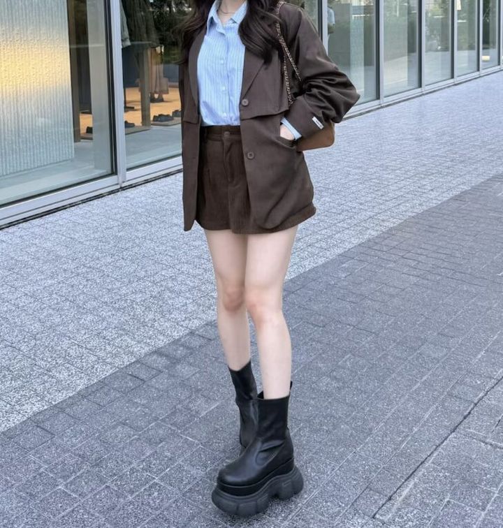 3. ショートパンツ×厚底ブーツで「頭でっかち見え」