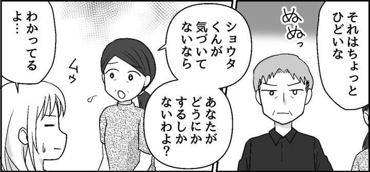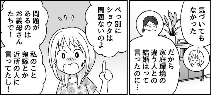 母は「だから苦労するって言ったのに」と呆れています。結婚前にショウタのご両親のふるまいを見て、あまり賛成できないと言っていたのです。今の状況を言い当てられていたようで、ちょっと悔しくなってしまいます。