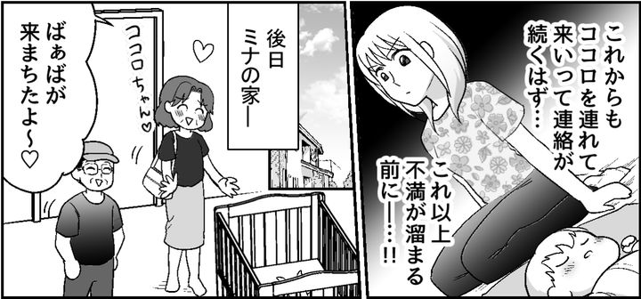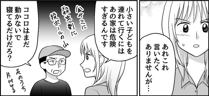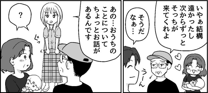 私だってよその家に対して、散らかっているとか危ないとか口出しするようなことはしたくないです。だからなるべく丁寧に伝えようとしたのに、義両親は茶化すような態度でした。あげくのはてに「産後で気が立っている」「ちょっと神経質すぎる」と私が悪いような言い方をしてきて……。私は義母の腕から娘を奪い返すと、義両親が改心しないかぎり二度と行かないと宣言したのでした。