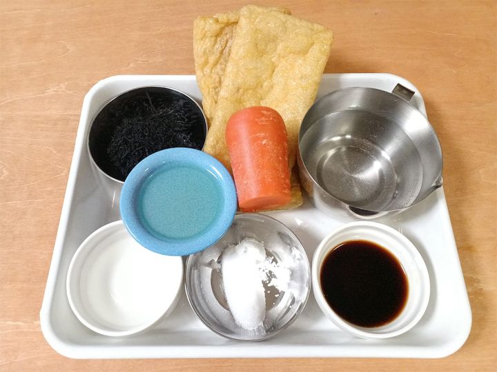 1. ひじきは水で戻したらザルにあげて水気を切る。にんじんと油揚げは千切りにしておく。