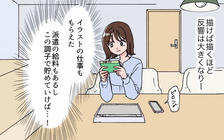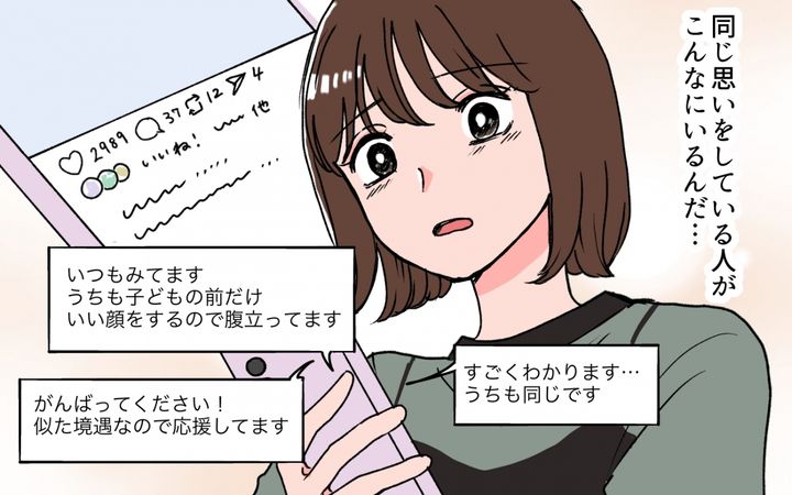 私は自分で稼げるように、むかしから好きだった絵を描くことを始めてみました。夜な夜な龍馬には秘密で、自分の「夫のモラハラ体験」を漫画にしてSNSに投稿し始めました。半年後、私の漫画はバズりました。スマホには「すごくわかります…うちも同じです」「似た境遇なので応援してます」といった、同じ悩みを抱える人々からの応援コメントが飛び交っていました。