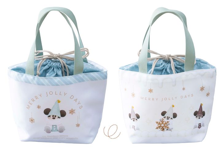 白をベースにリルリンリンのイラストをちりばめたスーベニアランチケース。持ち手はくすみミントカラーなのもポイント!きんちゃくタイプで、ひもで縛って閉められます。