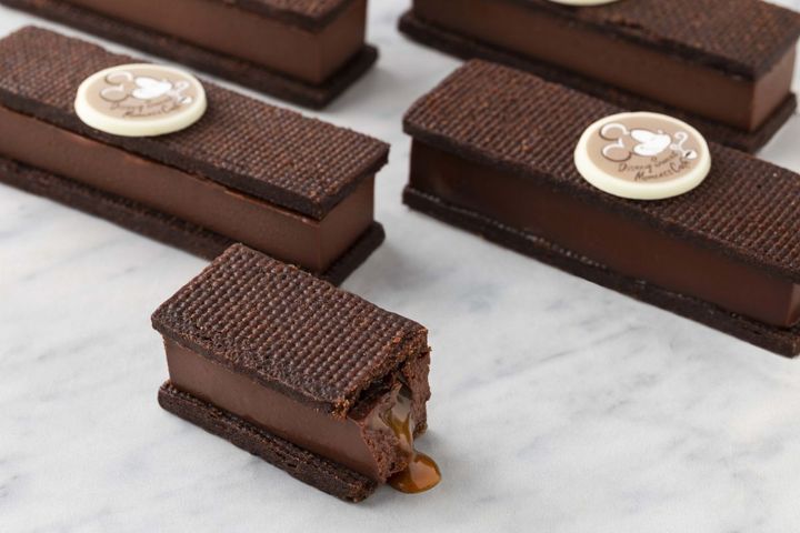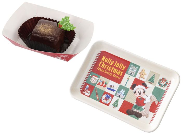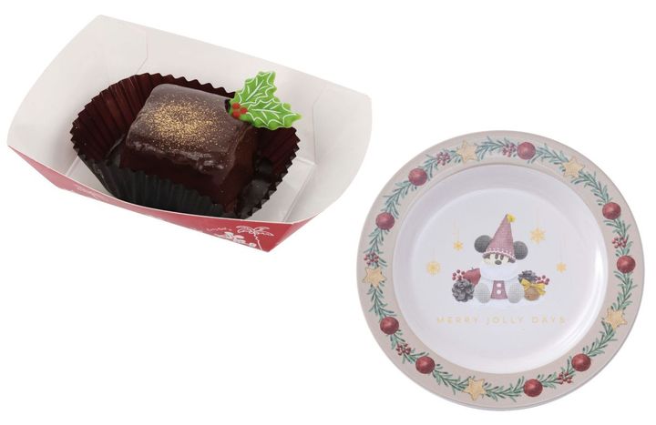 表面をチョコソースでコーティングした濃厚なチョコレートケーキが再登場。中にはアーモンドダイスが入っていて食感をプラス。プレートにはディズニー・クリスマスのパーク内をイメージさせるイラストとミッキーがデザインされています。