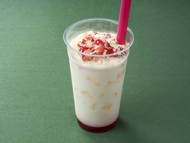 ミルクプリンとイチゴのピュレが入ったドリンクが今年も登場。トッピングのラズベリー顆粒とキャラメルクランチが味と食感のアクセントに。よく混ぜて飲むのがおすすめのデザートドリンクです。