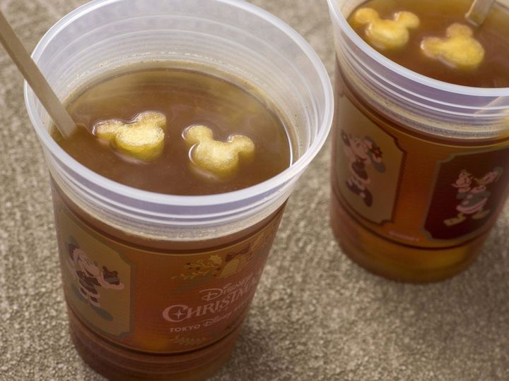 パークの冬の定番、ジンジャーの風味を利かせたホットアップルドリンク。ミッキーシェイプのアップルのほかに、ごろっと大きめのドライアップルも入っていて。食感も楽しめます。