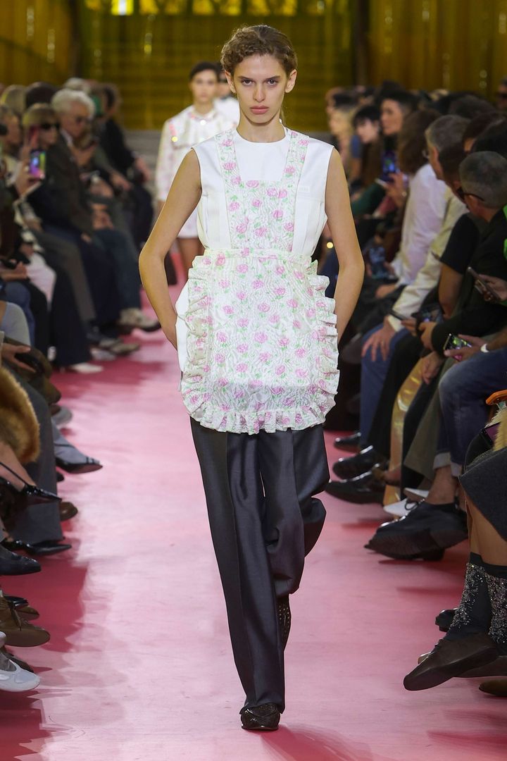 「生きること」と「仕事すること」は切っても切り離せないものですよね。だからこそ密接というか。ミウッチャは働くことの意義や意味を投げかけるアイテムとして、労働の普遍的な象徴としての衣服・エプロンに着目。確かにエプロンは家庭でも登場すれば、肉体労働、介護、医療、産業、幅広い働く場所で着用されています。ショーに登場したあるエプロンは世の母親が家庭で身に着けていそうな花柄の優しい感じのもの、あるエプロンは職人が使うような実用的な素材と形…多種多様な素材や装飾使いでバリエーション豊かなエプロンを登場させることで様々なレイヤーの働く人々を表現しました。