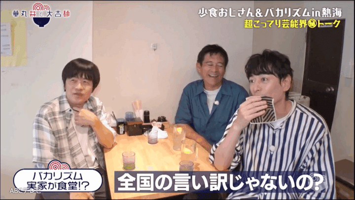 「パスタをちょっと茹でるくらいはありますけど、下手にキッチンをイジると奥さんに迷惑を掛けちゃうから。物の位置が変わったりとか」という発言を、華丸が自戒を込めて「九州男児の言い訳」と指摘する。バカリズムと華大の3人は、揃って福岡県の出身なのだ。
