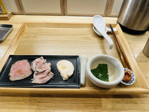 まず提供されたのは、自家製の鶏むね肉、ローストポーク、ローストビーフの3種。さらにドライトマトのムースと、すり鉢にはフレッシュバジルの葉が添えられ、すりすりするとバジルの香りが広がります。待つ間から味の変化を楽しめる仕掛けにワクワクさせられます。