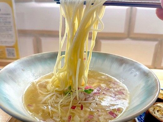 透明感のあるスープは鶏・豚・蛤の旨みが重なり、麺との相性も抜群。まずはそのまま味わった後、バジルをすった小さなすり鉢にスープと麺を加えると、香り立つイタリアン風に。さらにドライトマトムースをレンゲにのせると酸味と旨みが重なり、新しい味わいを発見できます。