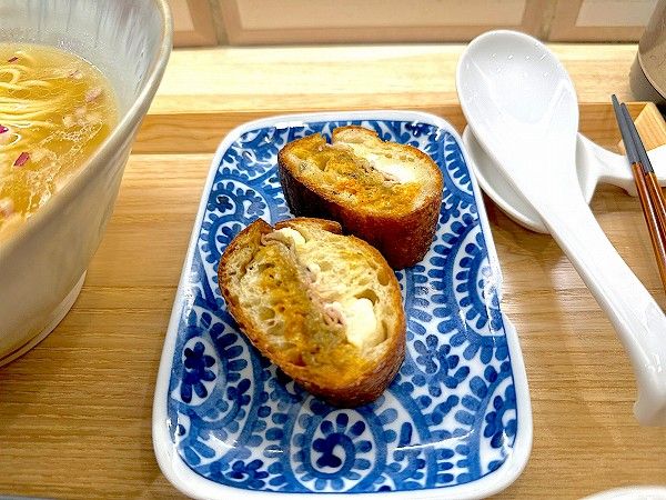 ラーメンの最後に楽しむのはサンドイッチ。クリームチーズ・アボカド・冷凍卵黄をマヨネーズで和え、ハードパンにサンドした一品はそのままでも完成度が高いのですが、スープにつけるとジューシーさが増し、最後まで手を抜かないこだわりを感じられます。