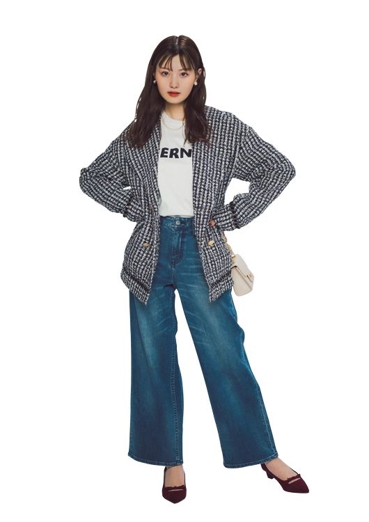 ツイードジャケット/着回し Tシャツ¥7,920/ドレステリア(ドレステリア 渋谷スクランブルスクエア店) パンツ¥16,500/ヘルシーデニム(アンタイトル) イヤリング¥3,150/アビステ ネックレス¥3,850/Boite de maco(ロードス) バッグ¥2,790/神戸レタス パンプス¥18,700/Stola.