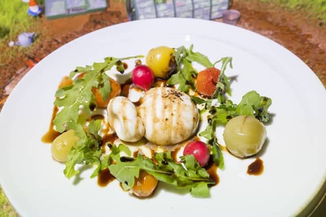 プチシェフがサラダを盛り付け終えると、今度は “本物” のサラダが運ばれます。ハーブ野菜のセルバチコに、歯応えのいいラディッシュ、カラフルトマトのマリネが並び、バルサミコのドレッシングがかかります。ブッラータチーズもトロリとなめらかな逸品です。