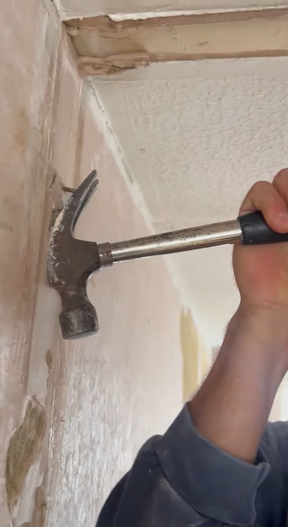 ハンマーの裏側についている釘抜きを使って壁に刺さった釘を抜く男性。 釘をゆっくり抜いているその様子は、悪戦苦闘しているように見えますが、作業中の男性はビックリする状況にあったのです!!