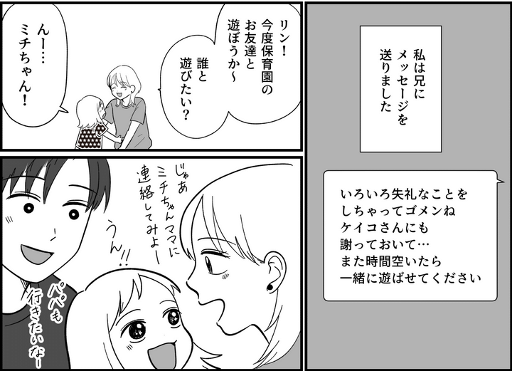 私(ナオ)は、夫のカズナリと娘のリン(3才)の3人暮らし。10才年上の兄コウジとは昔からとても仲良しです! 兄はケイコさんと結婚し、今では中2のアヤネちゃん、小4のカオリちゃん、6才のマドカちゃんの3姉妹の父。兄の家に遊びに行くと、一人っ子のリンはお姉さんたちにたくさん遊んでもらってとっても楽しそう! しかし普段から遊びに誘ってもドタキャンばかりの兄家族。めげずにお菓子を渡しに行ってみると、なんと! 風邪で遊べないというのは嘘だったのです。私は、素っ気ない態度を取ってくるケイコさんが諸悪の根源であると予想。実家の母に話すと、母がケイコさんに話してくれると言っていたのですが……?