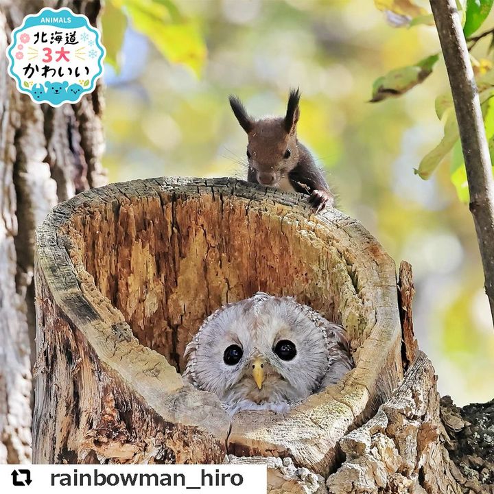 エゾフクロウの巣穴をのぞき込んでいるのは、エゾフクロウから見れば、〝ごちそう〟で〝エサ〟であるはずの、エゾリス。