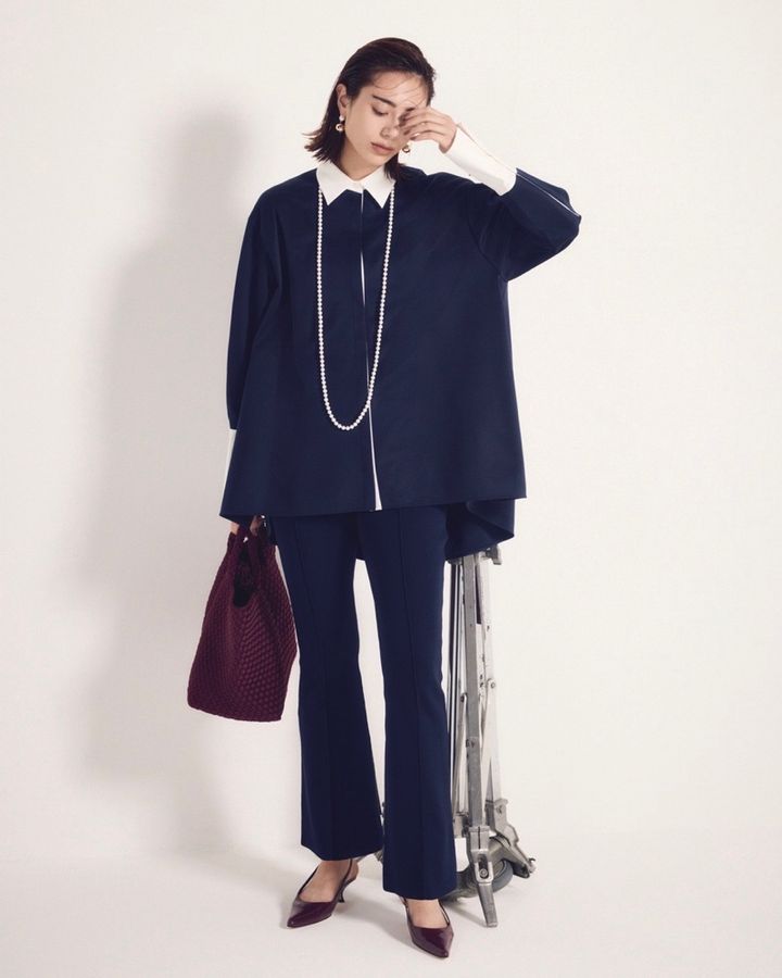 10月28日(火)、ハリ感のあるオーバーサイズシャツを主役にした、ネイビーのワントーンコーデ。美脚見えが叶うフレアパンツで、全身のシルエットをすっきりと。ロングパールネックレスで上品な縦長ラインを強調し、ボルドーのバッグとパンプスを差し色にすれば、オーバーサイズ×コンパクトの緩急で、きれいめ通勤スタイルをモードにアップデートしてくれます。
