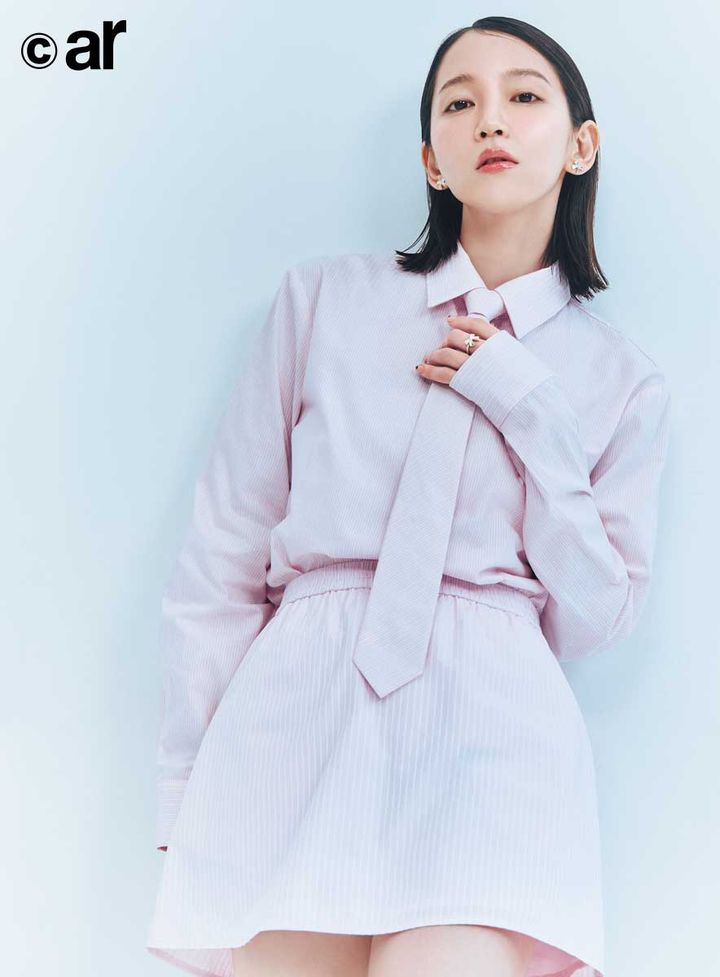 吉岡里帆。ar9月号より シャツ(ネクタイ付き)¥12,480/クランク(ハナ コリア) スカート¥14,300/マルディメクルディ(マルディメク ルディジャパン) ピアス¥16,200、リング¥10,600/マイアメイドストア(ロードス)
