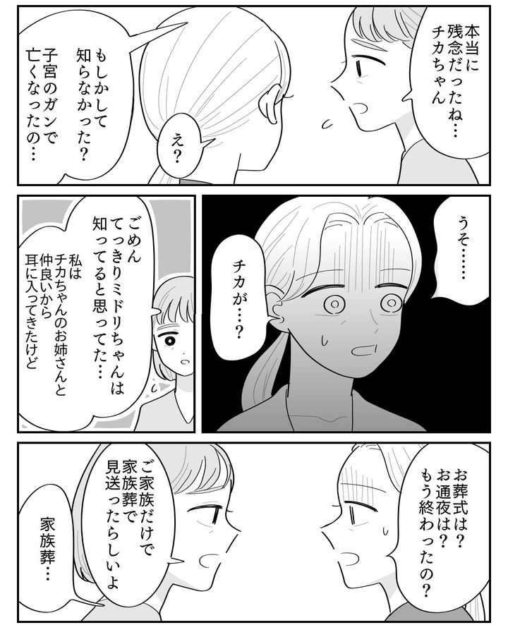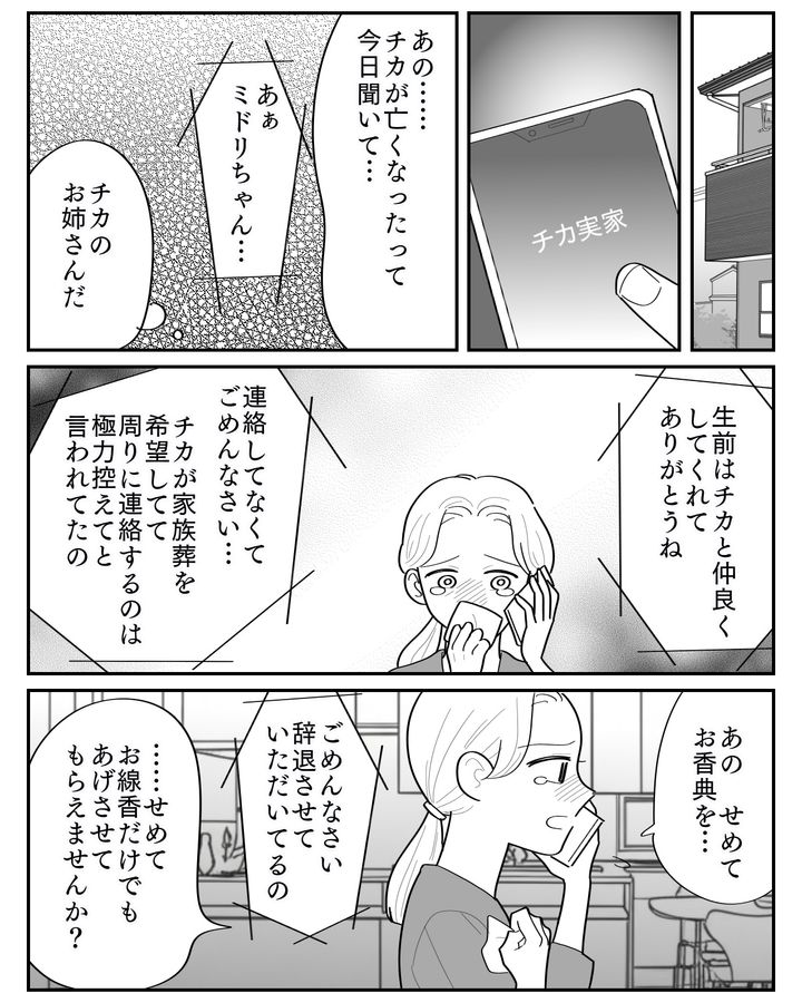 チカの実家に連絡して「せめてお線香だけでもあげさせてほしい」と申し出ましたが、チカのお姉さんからは「お気持ちだけで十分だからね」と断られます。そのキッパリとした口調に、私はそのまま引き下がるしかありませんでした。