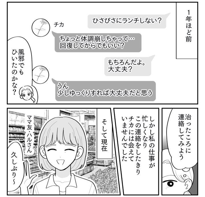 1年ほど前、私はチカとメッセージのやりとりをしました。落ち着いたらまた連絡しようと思ってそのままになり、しばらく会えていませんでした。すると先日、ママ友のハルさんとスーパーでバッタリ会い、思わぬことを言われたのです。