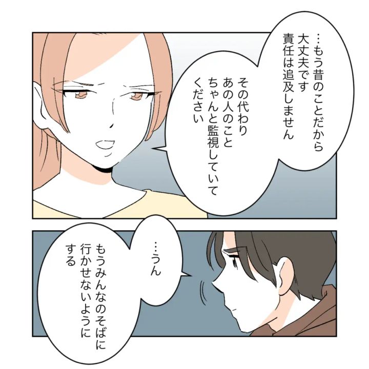 サクラは落ち着いた様子で「・・・もう昔のことだから大丈夫です、責任は追及しません、その代わりあの人のことちゃんと監視していてください」と言いました。ワタルは真剣な表情で「もうみんなのそばには行かせないようにする」と約束しました。
