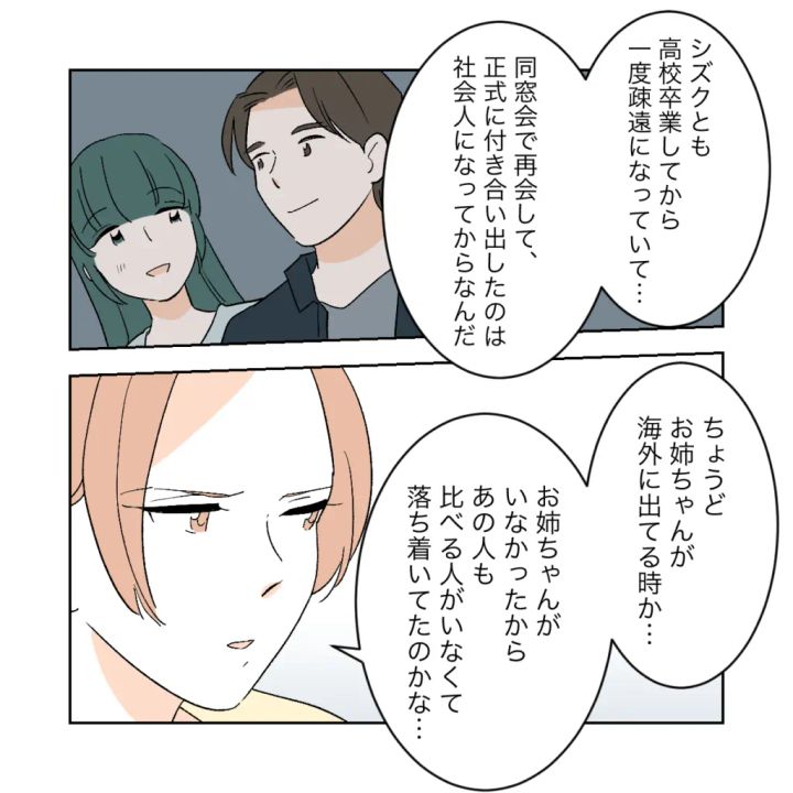 ですが、ワタルとシズクは高校卒業後に一度疎遠になっていて、社会人になってから正式に交際を始め、結婚に至りました。ワタルが惹かれたのは純粋にシズクの人柄であって、高校時代にシズクがついた嘘が、2人の関係を進展させる直接的なきっかけになったわけではないとワタルは話します。それを聞いたサクラは、「お姉ちゃんがいなかったから比べる対象がなくて落ち着いてたのかな・・・」とつぶやきました。