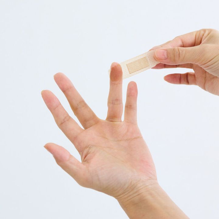 絆創膏のサイズの規定はありませんが、いちばん貼りやすいのは標準サイズの細長いタイプ。