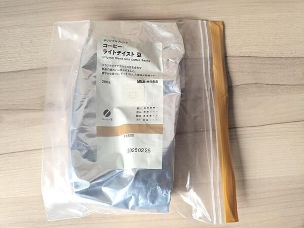 底マチ付きで自立しやすいので、食材をつぶさず立てて保存ができます。無印良品のオリジナルコーヒー豆200gがすっぽり袋ごと入るので、コーヒーの保存にも便利です。