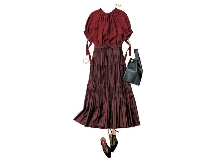 ブラウス¥35,200スカート¥49,500(ともにデパリエ/デパリエ 伊勢丹新宿店)バッグ¥42,900(オルセット/オルサ)パンプス¥75,900(ペリーコ/アマン)ピアス¥4,180(ヘンカ/ロードス)ブレスレット¥73,700(ブランイリス/ブランイリス トーキョー)