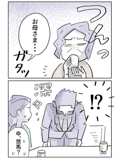 母の好物をたくさん用意してきた彼でしたが、母は「こんなものでは騙されないわ」と笑顔ひとつ見せず、じっと様子をうかがいます。