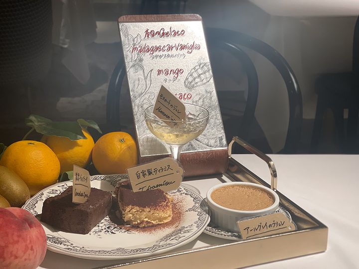 「濃厚チョコラータ」、「自家製ティラミス」、「モスカートのジュレ」、「アールグレイのブリュレ」、「本日のジェラート」(取材日2025年7月はマダガスカルバニラ、マンゴー、マスカットより1種類)から、自分の好きなものを選ぶことができます。
