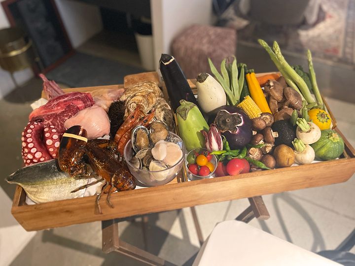 取材日(2025年7月)に用意されていたのは、兵庫県明石市のタコや国産養殖のオマールエビ、北海道産のホタテやカキ、千葉県九十九里浜のハマグリなどの魚介類をはじめ、山形県産の黒毛和牛、北海道産の鴨の胸肉、地鶏のモモ肉、骨つきのラム肉など、全国各地で取れた豪華な食材たち。
