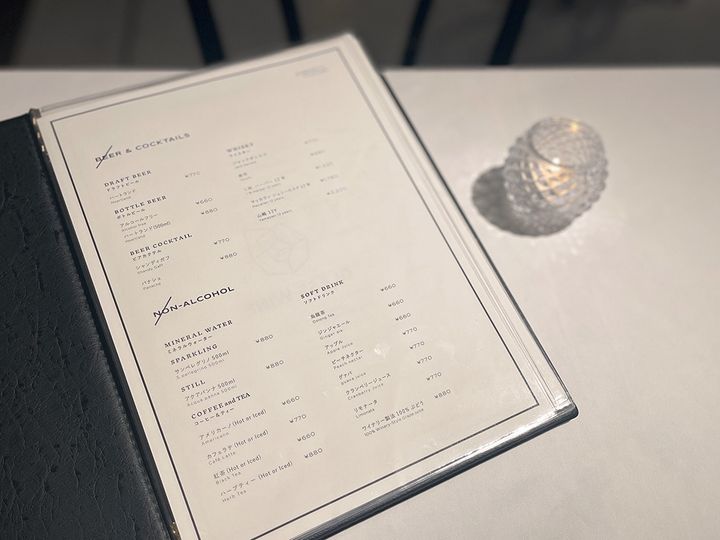 2階の席についたら、まずはドリンク選びからスタート。ビールやカクテル、グラス&ボトルワイン、ソフトドリンクまで幅広いドリンクが80種類ほど揃います。