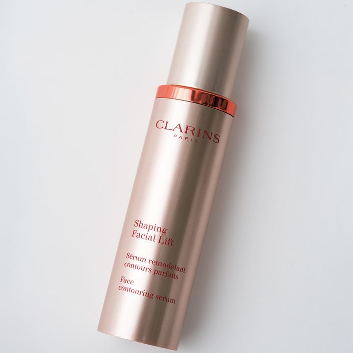 手のひらで温めたクラランスのVコントア セラムを顔全体になじませてから、手で頰を押さえて下を向き圧をかけて10秒間プレス。顔がシュッとします。