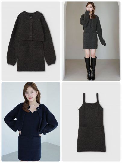 ショートカーディガンと同素材のニットワンピースをセットに。単品でも着用できるため、コーディネートの幅が広がるはず。