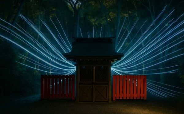 無数の光の糸が境内を包み込み、歩くごとに異なる表情を見せる幻想的な光景が広がり、細やかな光が木々や参道に降りそそぎ、まるで星の川を渡るような体験となります。古社の持つ静謐な力と現代アートの融合が、ここでしか味わえない神秘的な夜を生み出します。 ※展示の色合いや見え方は、季節や天候、日照条件などにより異なる場合があります。