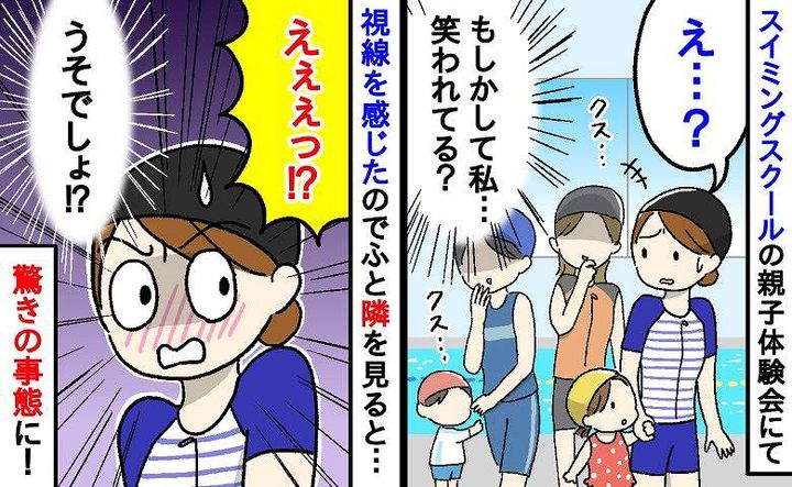 体験会当日、スイミングのレッスンが始まる前に、プールサイドで娘と手をつないで先生からの指示を待っていると、後ろからママさんたちの笑い声が聞こえてきました。笑い声はどうも私たちに向けられているようでした。視線を感じて、横にいた親子と目を合わせると……。