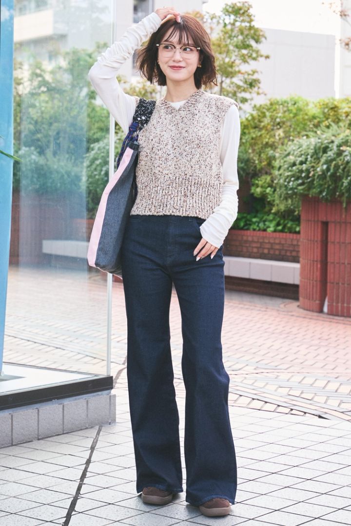 「Olu.の約8,000円のデニムに、MELLOWNEONの ざっくり編みニットをあわせました。