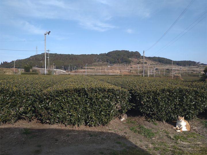こちらは真冬の茶畑の風景です。南国鹿児島といえども寒い日は訪れます。わが家は茶畑に囲まれているのですが、寒い日にはよく茶の樹の下で休憩している猫たちを見かけます。