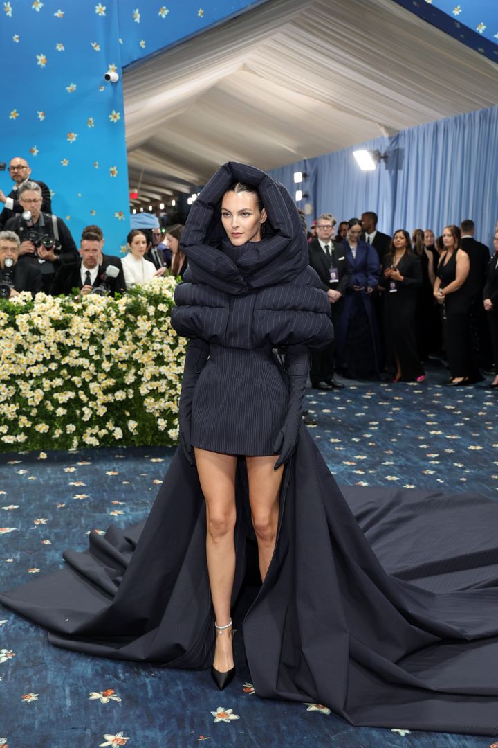 2025年のメット・ガラでは、エドワード・エニンフルによるモンクレール×EE72のブラックドレスをチョイス。コンパクトなコルセットとボリューミーなトレーンを備えたミニドレスは、メンズライクなピンストライプ柄が、彼女のクールビューティを引き立てています。