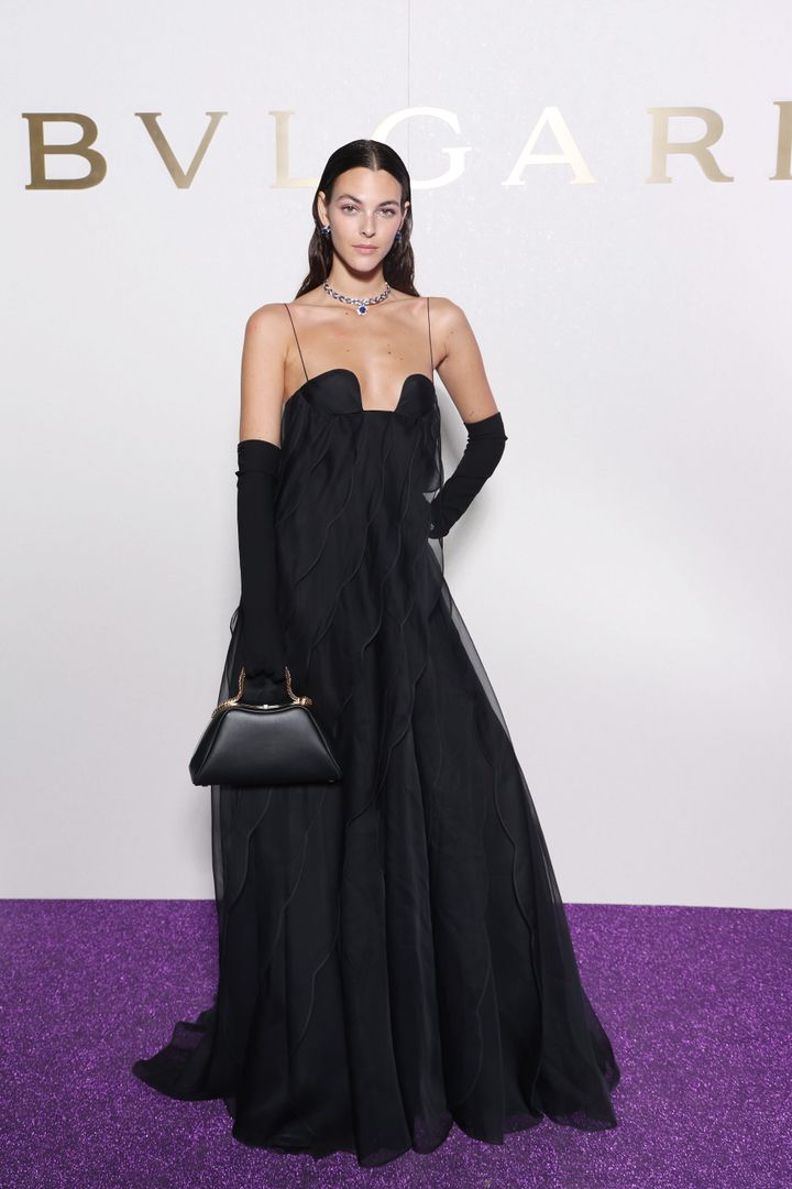 ブランドのパーティなどでは、ブラックドレスをチョイスすることが多いヴィットリア。2022年9月、ブルガリのパーティでは、胸元のカッティングと、スカラップヘムのラッフルがインパクトを放つヴァレンティノのブラックドレスに、ブルガリのサファイアネックレスをコーディネート。