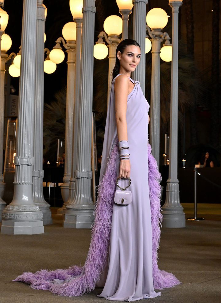 グッチのホルターネックドレスは、トレーンに施されたフェザーのトリミングが華やかな存在感を放って。バングル、ミニバッグもラベンダーで統一しエレガンスたっぷり。2024年のLACMAアート+フィルム ガラより。
