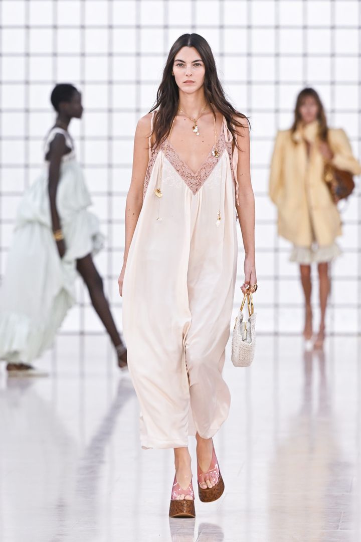 胸元がピンクベージュのレースでトリミングされたクロエのシルクスリップドレスをエフォートレスに着こなして。ゴールドトーンのシェルのネックレスもノンシャランな雰囲気です。2024年9月、クロエのランウェイより。
