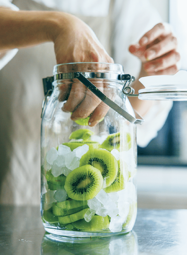 4. 瓶の口ぎりぎりまで詰めたらふたをする。冷暗所で保存し、1日1 回、瓶を揺する。1ヵ月ほどで完成したら、キウイはとり除き、別の保存容器に移しておく。