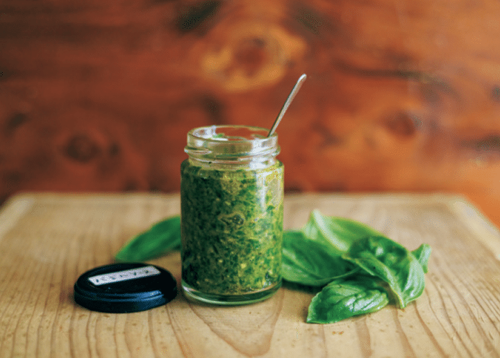 4. 保存容器に3 のバジルソースを入れ、冷蔵庫で保存する。バジルソースは空気に触れると変色しやすいため、表面をラップなどで覆っておくとよい。