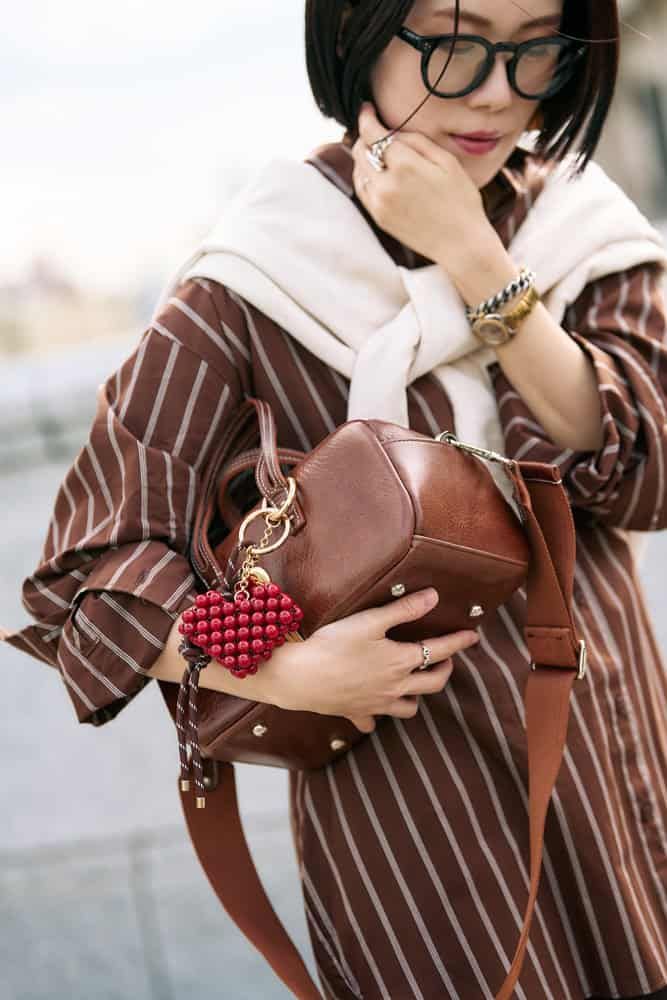 チャームレイヤードで印象変化!こだわりのバッグコーデ