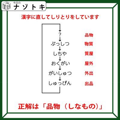 クイズです!「しゅっぴん→?→ぶっしつ→しちや→……。ハテナに入る言葉は?」単語のつながりを考えてみましょう【難易度LV3.・中辛】