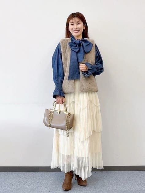 認定スタイリスト:田代かな子(身長157cm)「お出かけには、ファージレとリボンブラウス重ねて胸元からリボンを覗かせるフェミニンレイヤードがおすすめです。」