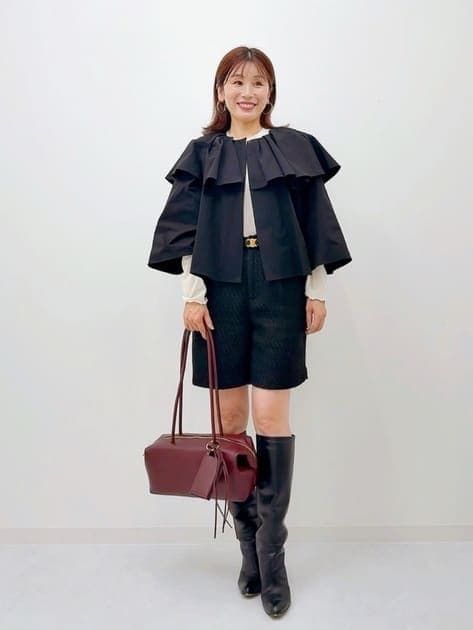 認定スタイリスト:田代かな子(身長157cm)「襟周りがフリルでアクセサリー要らずの華やかさがあるので、シンプルな長袖トップスの上に重ねるだけで秋冬のフェミニンレイヤードスタイルに。 ホックで簡単に脱ぎ着できるのも嬉しいポイント♪ふんわりシルエットですが、袖丈も着丈も短めなので重心が上がりスタイルアップします。」
